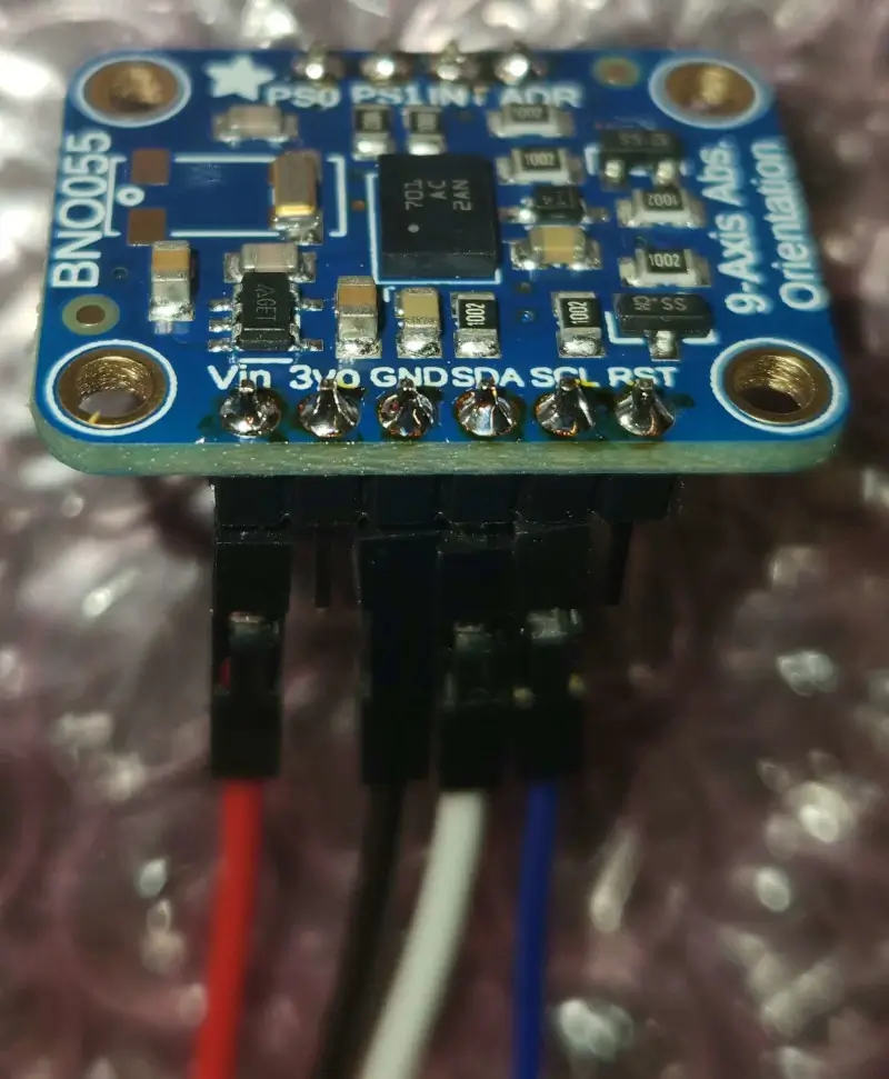 The I2C sensor cable is strain-reliefed to prevent tugging on its soldered connections to the external IMU.