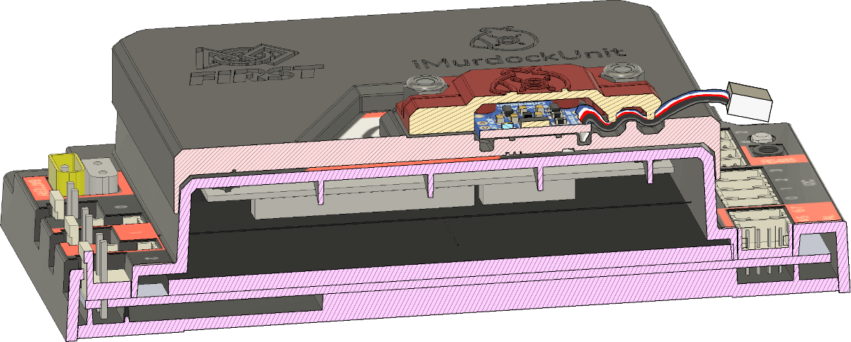 The assembled iMurdockUnit rides on a control or expansion hub's orange hump with diagonal white stripe. Rotate the iMurdockUnit so that its sensor cable extends towards the hub's I2C ports. Once aligned, press the iMurdocUnit down firmly onto the hub. Lastly, plug its dangling sensor wire into the hub's I2C port 1, 2, or 3 connector.